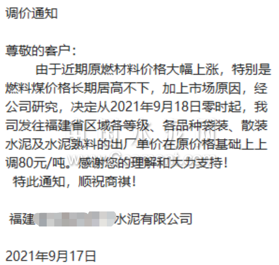 17日起省内一些主要厂家陆续通知上调各品种水泥价格40-50元/吨,价格将陆续落实到位。整体来看,金九银十传统旺季,需求向好,加之限电及成本压力等多重因素影响,本次企业对推涨价格较为坚挺。