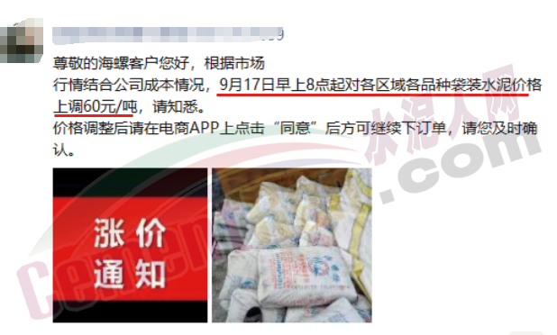 湖南地区双峰海螺、涟源海螺、邵阳海螺通知自9月17日起,对所有区域各品种水泥出厂价上调60元/吨。