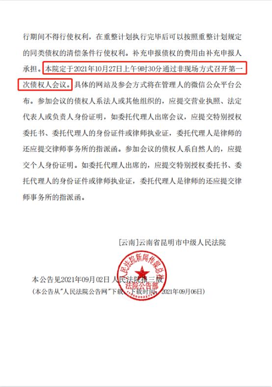 案件目前已进入债权申报程序,云南省昆明市中级人民法院公告显示,债权公司需在2021年10月15日前,向管理人申报债权。10月27日上午,将通过非现场方式召开第一次债权人会议。