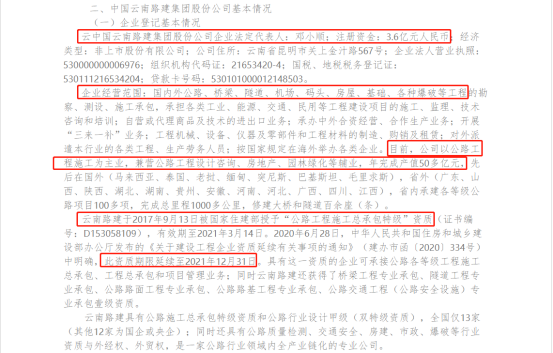 据了解,云南路建于2017年9月13日获得“公路工程施工总承包特级”资质,同时还拥有桥梁工程专业承包、隧道工程专业承包、公路路面工程专业承包、公路路基工程专业承包、公路交通工程(公路安全设施)专业承包壹级资质。