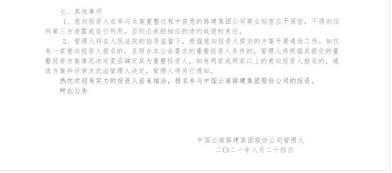据8月24日全国企业破产重整案件信息网发布的《中国云南路建集团股份公司重整投资人招募公告》,目前中国云南路建集团股份公司破产程序正在推进,有意向投资方与管理人对接,向管理人表达了参与重整投资的初步意向。