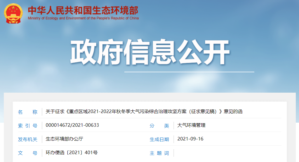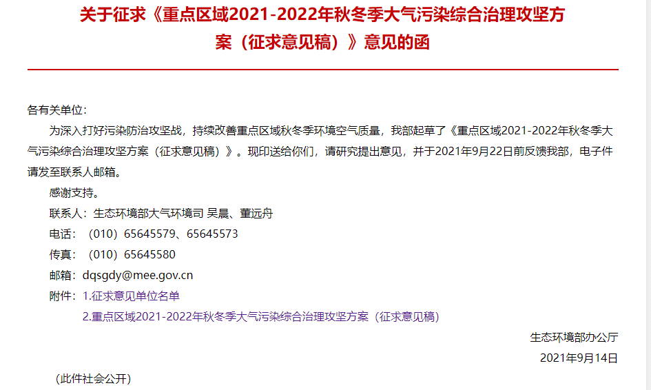 9月16日,生态环境部发布《重点区域2021-2022秋冬季大气污染综合治理攻坚方案(征求意见稿)意见的函》。意见征求截止日期为9月22日,正式稿即将正式发布。