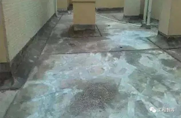 防水材料不合格,涂刮铺贴不均匀,粘结不牢,局部漏铺等。
