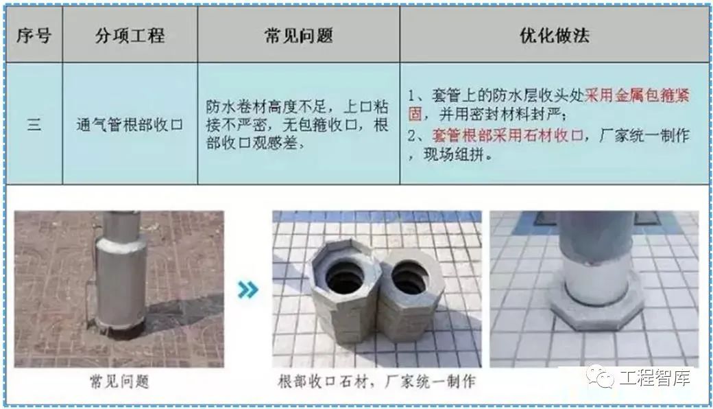 对屋面雨水口,如墙、交形缝、檐口、天窗、烟囱和通过屋面的管道等细部处理,做到构造合理,节点严密,在与基层的交接处和转角处,找平层均应做成圆弧形,使用不同的防水卷材,找平层应做不同的圆弧半径。