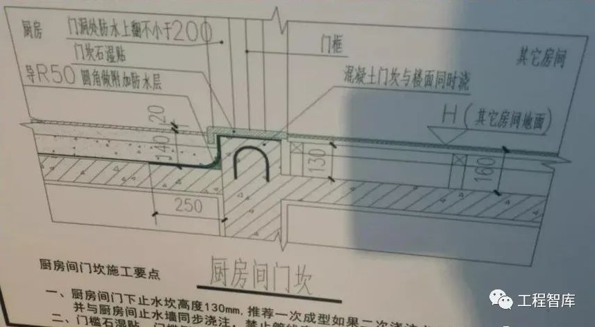 厨房门坎采用一次浇筑成型,且必须插筋(间距200mm)。