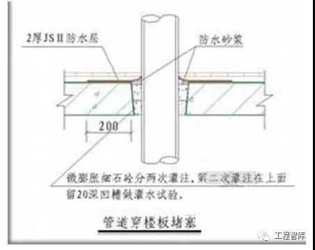 楼板堵洞:保证管道与孔洞边缘有30-50mm的缝隙,并清理掉松散碎碴,用厚度16-20mm木板制作模板,用14#铁丝吊紧在楼板下,然后集中搅拌豆石混凝土,掺3%膨胀剂,混凝土浇筑前将洞口湿润,浇筑时振捣密实,浇筑养护不小于7d。