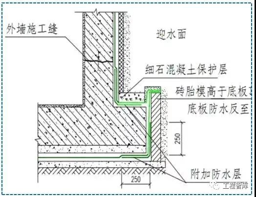 施工缝是防水混凝土工程中的薄弱部位,应尽量不留或少留。底板混凝土应连续浇灌,不得留施工缝。底板与墙体间如必须留施工缝时,应留在墙体上,并且要高出底板上表面不少于200毫米。墙体上不得留垂直施工缝,必须留时,应与变形缝统一起来。