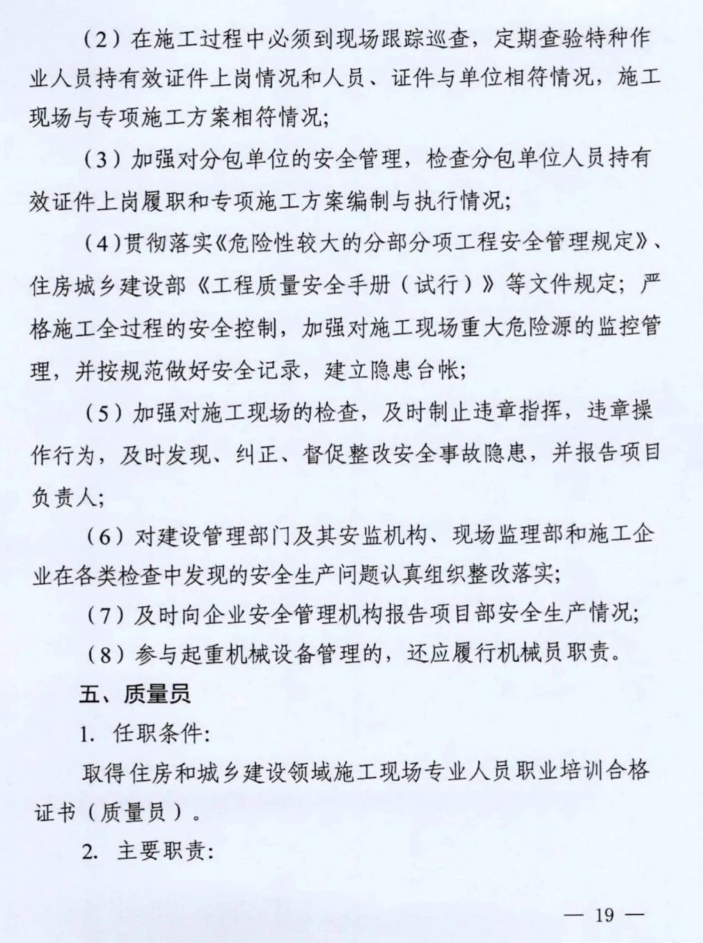 第三条 建筑工程施工项目部、现场监理部关键岗位人员数量不得低于本办法规定(施工项目部关键岗位人员配备标准见附件1、现场监理部关键岗位人员配备标准见附件2),且必须按规定认真履行岗位职责(施工项目部关键岗位人员任职条件和职责详见附件3,现场监理部关键岗位人员任职条件和职责详见附件4)。施工企业应根据工程需要配备其他相应的管理人员。