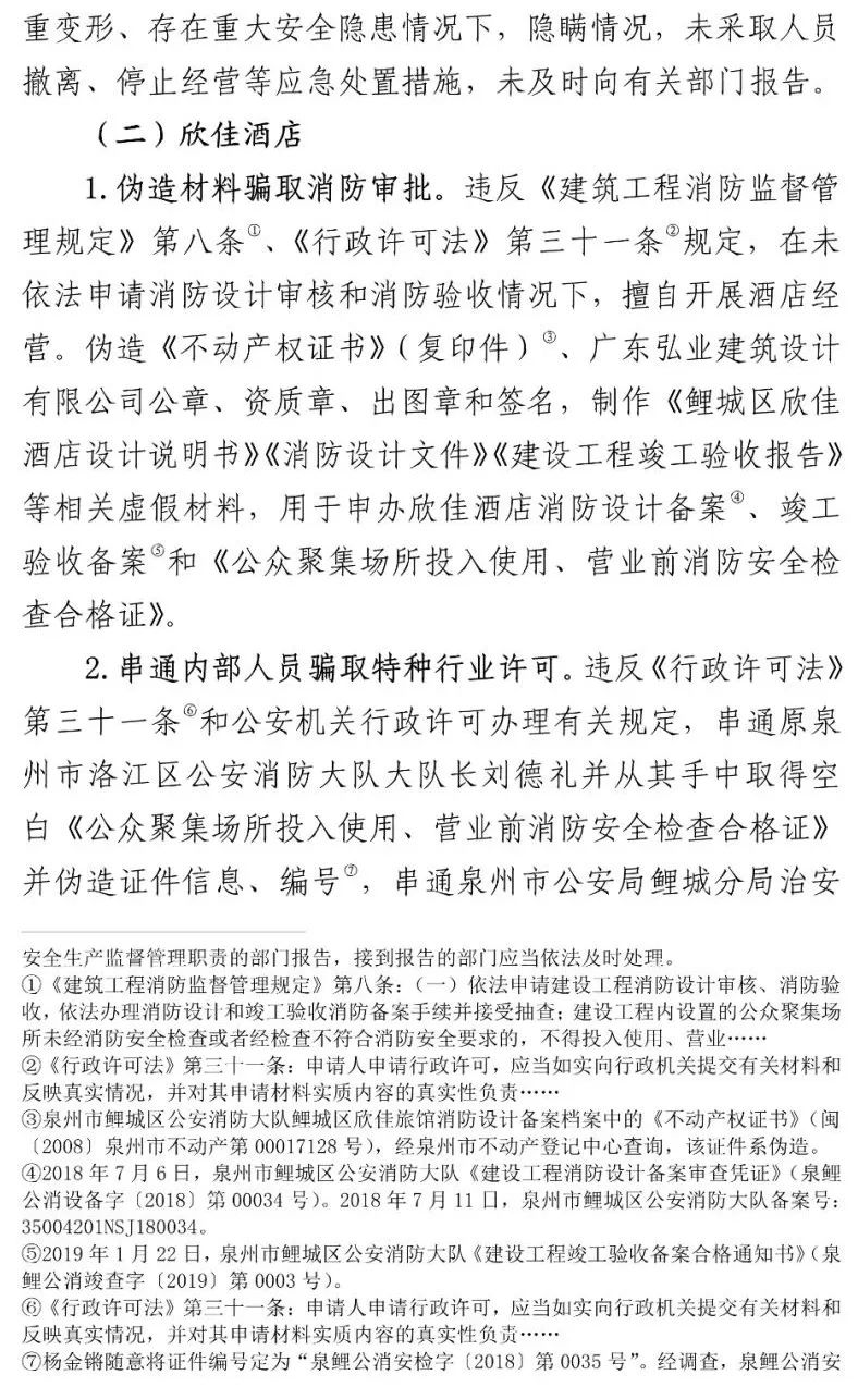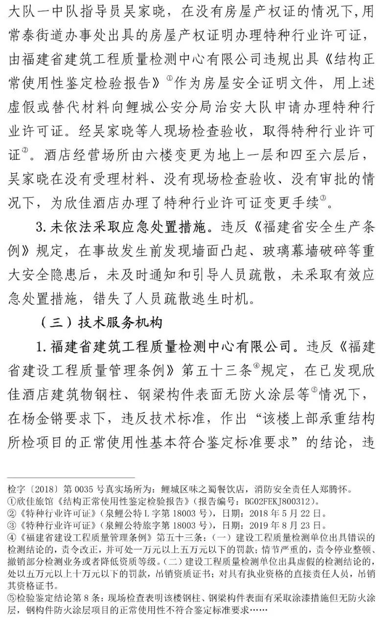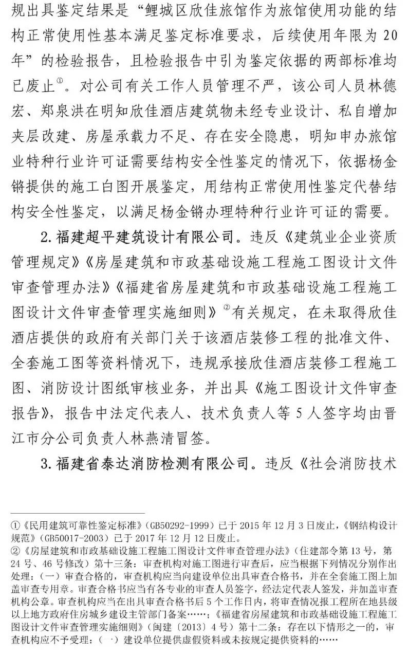 另查明,福建省建筑工程质量检测中心有限公司建筑物可靠性鉴定与抗震研究所承担检验职责的有关工作人员,在对欣佳酒店建筑物进行房屋质量检测时,明知存在安全隐患,仍违反技术标准要求,故意提供虚假证明文件,应承担相应刑事责任。李某生等2人在不具备相应资质的情况下,明知杨某锵未取得相关规划和建设手续,为欣佳酒店建筑物建设、夹层隔间、消防备案绘制建筑施工图纸,应承担相应刑事责任。泉州市公安局鲤城分局原副局长张某辉、泉州市消防救援支队应急通信与车辆勤务站原站长刘某礼、泉州市公安局鲤城分局治安大队一中队原指导员吴某晓等7名公职人员存在滥用职权、玩忽职守、受贿、徇私枉法、伪造国家机关证件等犯罪行为。
