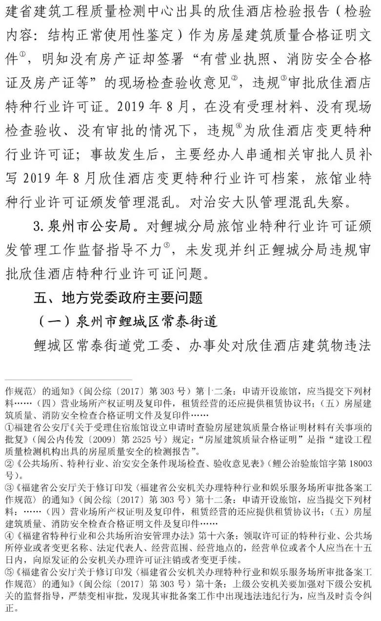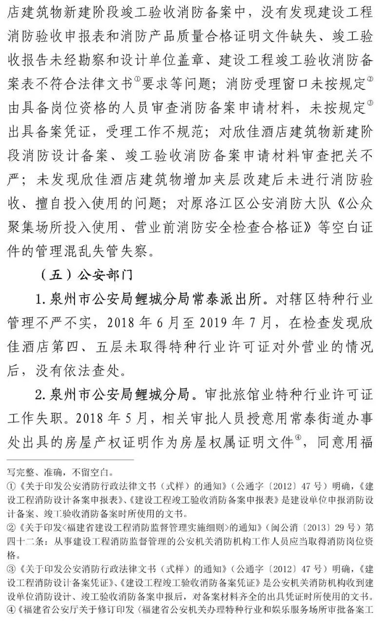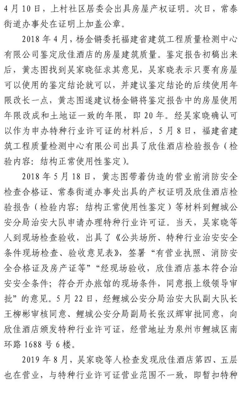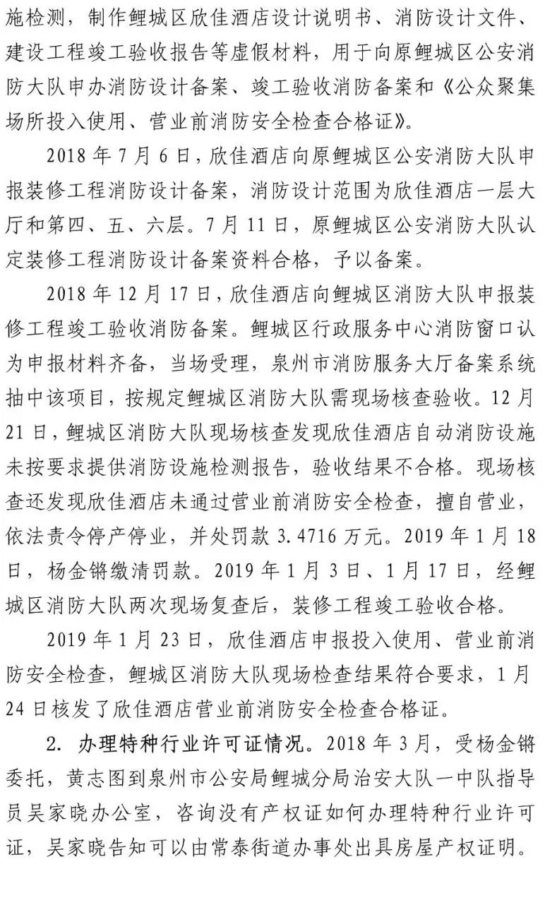 另查明,福建省建筑工程质量检测中心有限公司建筑物可靠性鉴定与抗震研究所承担检验职责的有关工作人员,在对欣佳酒店建筑物进行房屋质量检测时,明知存在安全隐患,仍违反技术标准要求,故意提供虚假证明文件,应承担相应刑事责任。李某生等2人在不具备相应资质的情况下,明知杨某锵未取得相关规划和建设手续,为欣佳酒店建筑物建设、夹层隔间、消防备案绘制建筑施工图纸,应承担相应刑事责任。泉州市公安局鲤城分局原副局长张某辉、泉州市消防救援支队应急通信与车辆勤务站原站长刘某礼、泉州市公安局鲤城分局治安大队一中队原指导员吴某晓等7名公职人员存在滥用职权、玩忽职守、受贿、徇私枉法、伪造国家机关证件等犯罪行为。