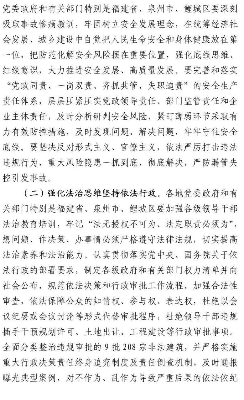 福建省纪检监察机关对该起事故中存在失职失责问题的41名公职人员给予党纪政务处分,1人予以诫勉。其中:省管干部9人、泉州市管及以下干部33人;主要领导责任14人、重要领导责任5人、监督责任2人、直接责任21人;厅级干部7人、处级干部13人、其他22人。
