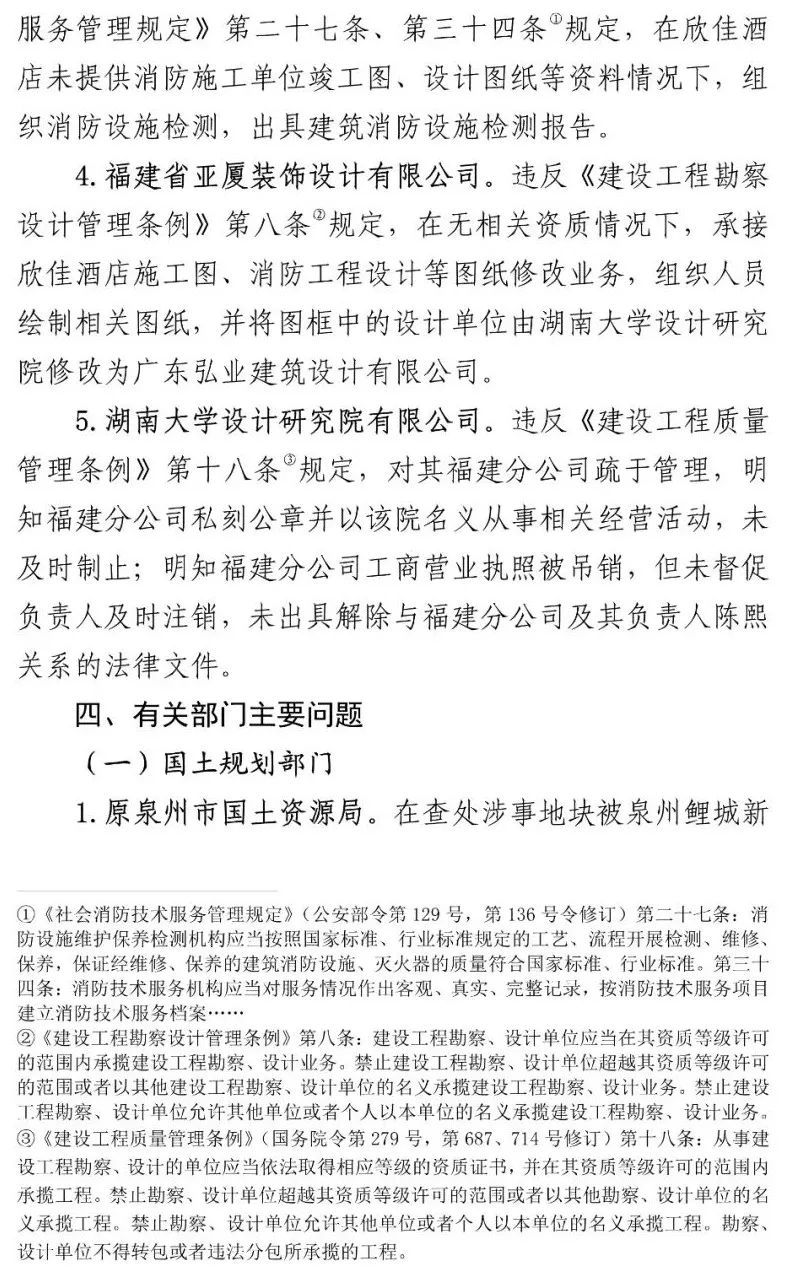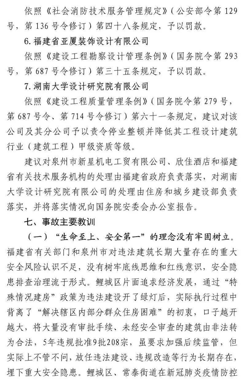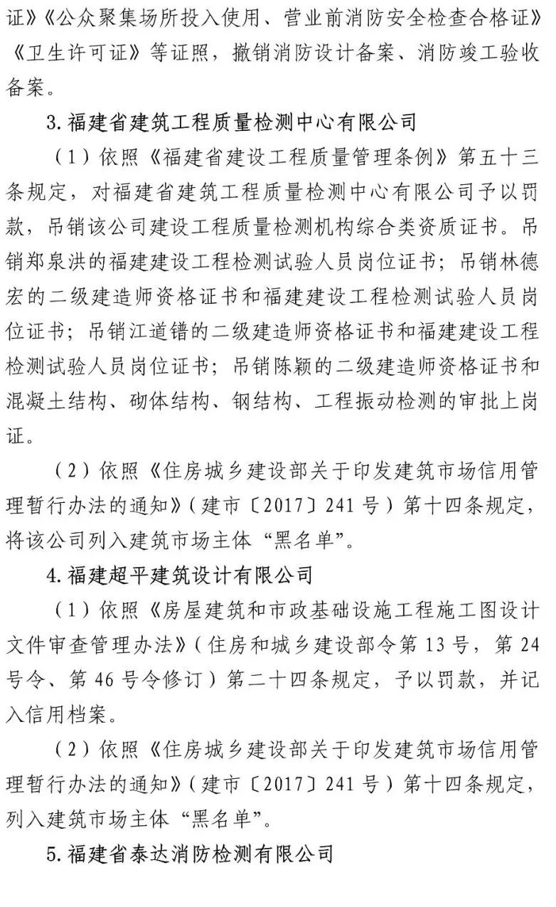 福建省建筑工程质量检测中心有限公司、福建超平建筑设计有限公司、福建省泰达消防检测有限公司、福建省亚厦装饰设计有限公司、湖南大学设计研究院有限公司违规承接业务,出具虚假报告,制作虚假材料帮助事故企业通过行政审批。