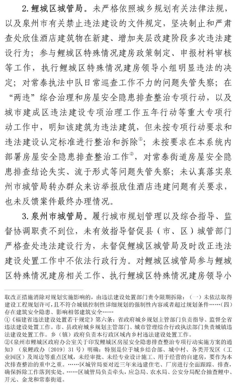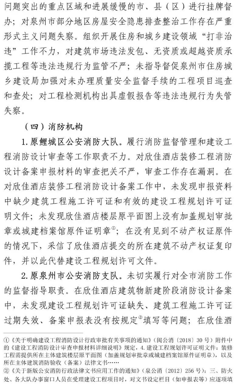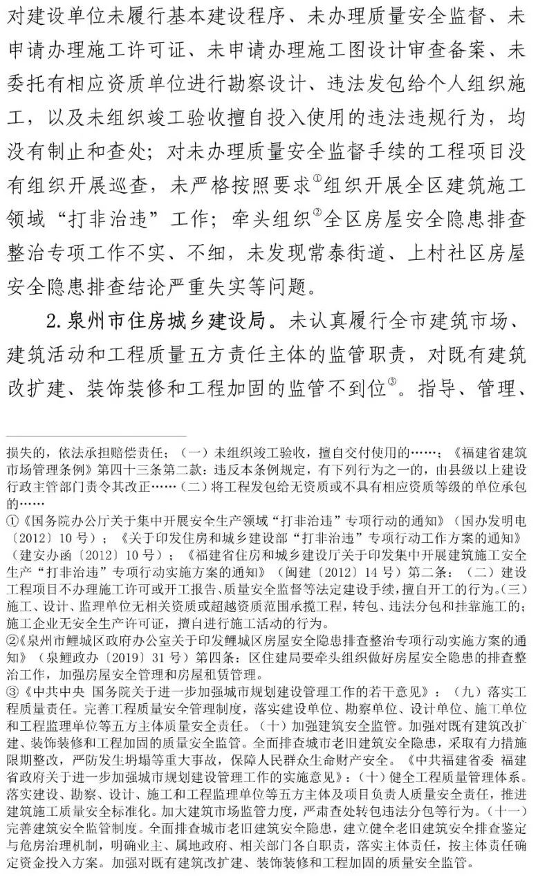 泉州市各级住建部门对建筑活动和工程质量负有监管主体责任,但对于欣佳酒店建筑的长期违法违规行为从未发现和查处。