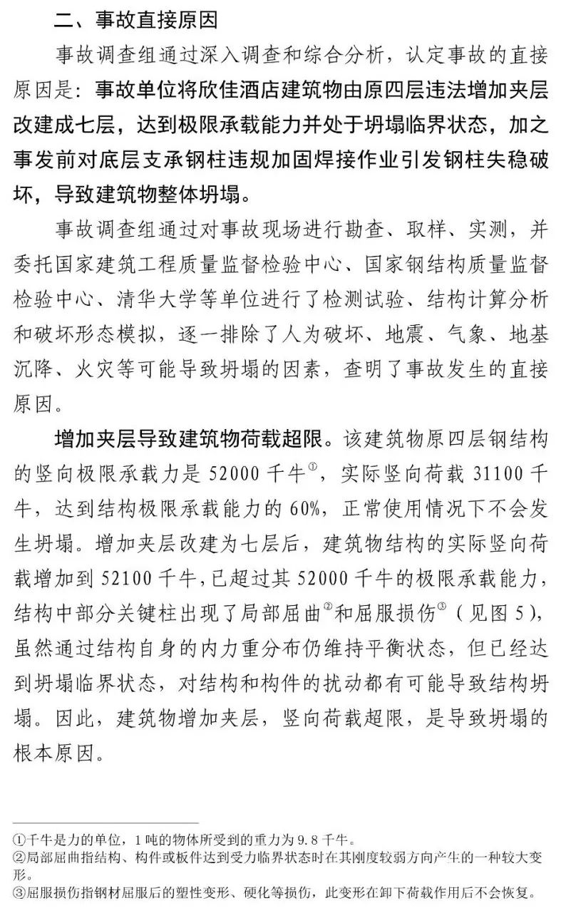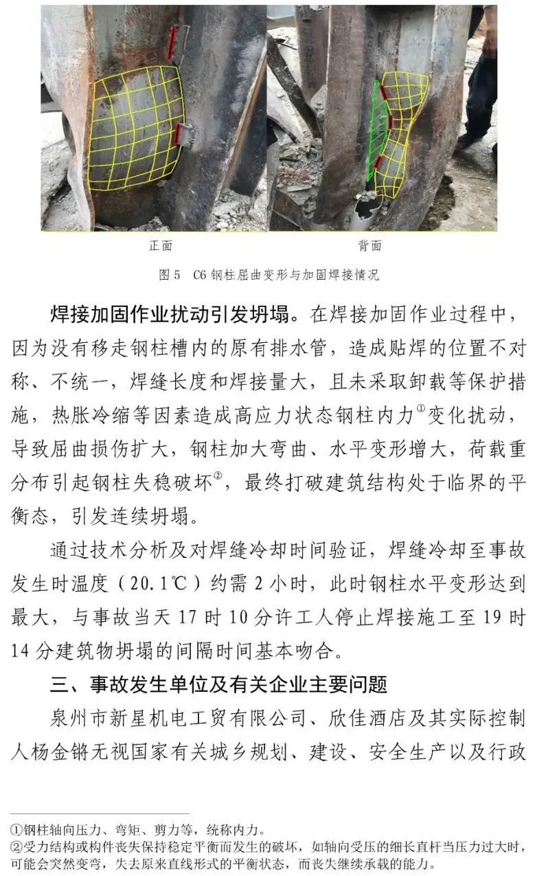 事故责任单位泉州市新星机电工贸有限公司将欣佳酒店建筑物由原四层违法增加夹层改建成七层,达到极限承载能力并处于坍塌临界状态,加之事发前对底层支承钢柱违规加固焊接作业引发钢柱失稳破坏,导致建筑物整体坍塌。