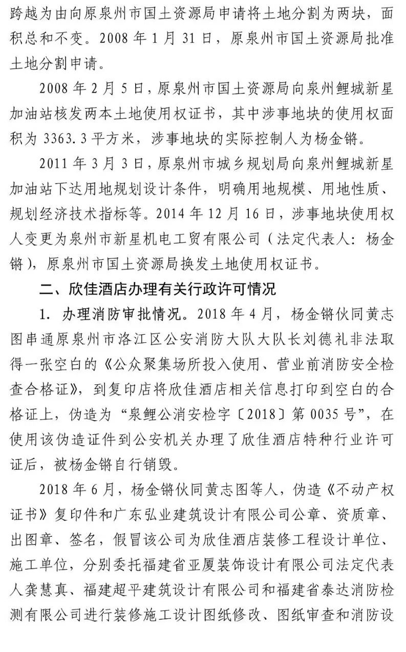 泉州市新星机电工贸公司、欣佳酒店实际控制人杨金锵以涉嫌重大责任事故罪、伪造国家机关证件罪于4月9日被逮捕;