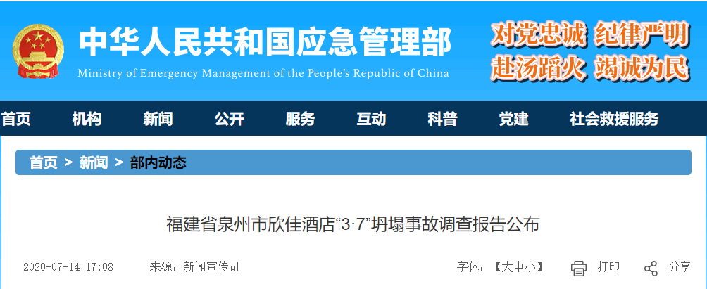 9月3日,福建省应急管理厅官网发布《福建省贯彻落实〈福建省泉州市欣佳酒店“3.07”坍塌事故调查报告〉整改方案》。《整改方案》将追责问责、事故防范和整改、事故警示教育列为整改目标,要求进一步落实追责问责工作。