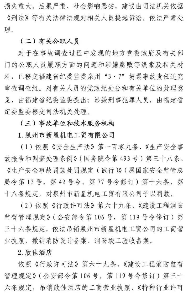 决定对泉州市新星机电工贸有限公司、欣佳酒店等六个事故单位和技术服务机构作出的处罚。