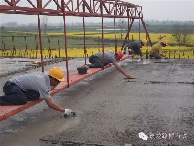 采用振动棒配合三辊轴摊铺机施工,以一联为作业单元进行施工,每个施工循环长度为10米左右,混凝土布料后采用振动棒初振一遍,三滚轴摊铺机施工时,采用前进振动,后退静滚的工艺,振动和静滚交叉进行,振动2-3遍,然后将振动轴提离标高带,前后静滚至平整度符合要求然后用3M刮尺饰面,每次饰面间隔约为30min,刮平饰面不少于3遍,并设专人检查迟杆与面层的接触情况。然后拆除轨道槽钢,用人工将轨道槽填满,木抹子人工找平,最后用铁抹压光成型。