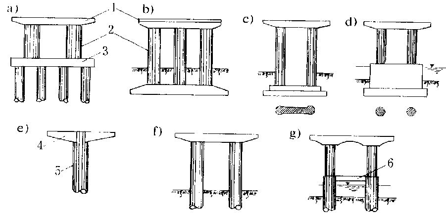 桩式墩是将钻孔桩基础向上延伸作为桥墩的墩身,在桩顶浇筑盖梁。在墩位上的横向可以是一根或多根桩,设置一排桩时叫排桩墩。这种墩型有很多优点,如节约材料、施工简便、外形简洁,特别适合在平原地区建桥时使用;但是它存在跨度上的局限性(一般小于13m),由于墩身较柔,抗撞能力差,不宜在有漂流物和流速过大的河流中采用。