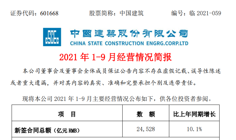 近日,中国建筑官方公告披露,2021 年 1-9 月,中国建筑股份有限公司(以下简称“中国建筑”)完成新签合同额 24528 亿元,同比增长 10.1%。前三季度,其年度新签合同额任务目标完成率已达 70%,距离 3.5 万亿的年度目标额还有约 1 万亿的距离。