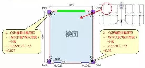 (二)计算凸出墙面柱截面积: