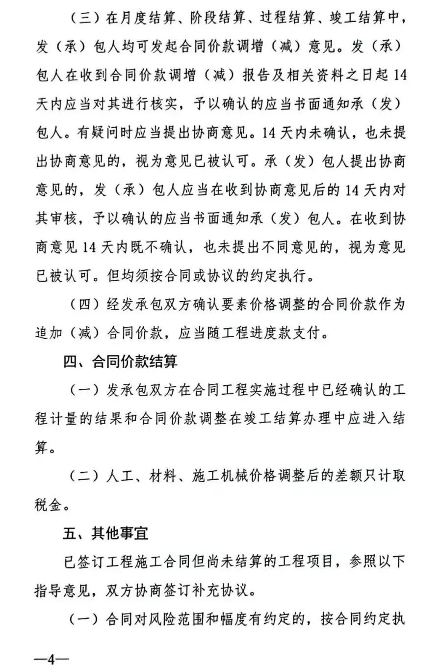 4.施工合同中约定不调整材料价格或约定承包人承担无限材料价格风险的,合同履行期间,当主要材料价格的涨跌幅度过大,继续履行合同对合同一方显失公平的,发承包双方应本着实事求是和公平公正的原则,协商签订主要材料价格调整的补充协议。