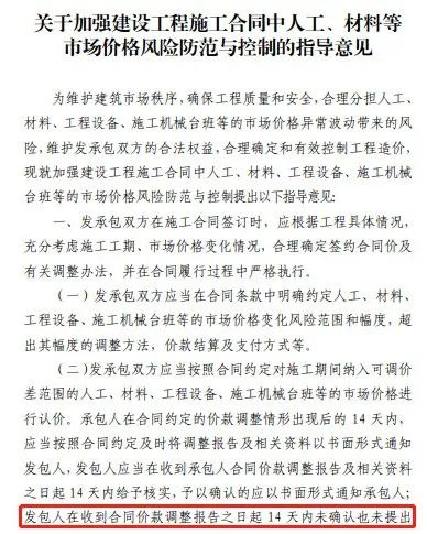 施工合同已约定不调整或承包人承担无限材料价格风险的,也应调整价差,补签协议!多省发文明确北京市住房和城乡建设委员会印发《关于加强建设工程施工合同中人工、材料等市场价格风险防范与控制的指导意见》的通知内蒙古自治区住房和城乡建设厅关于做好建设工程材料价格风险管控的通知关于建筑材料价格风险管控指导意见的通知