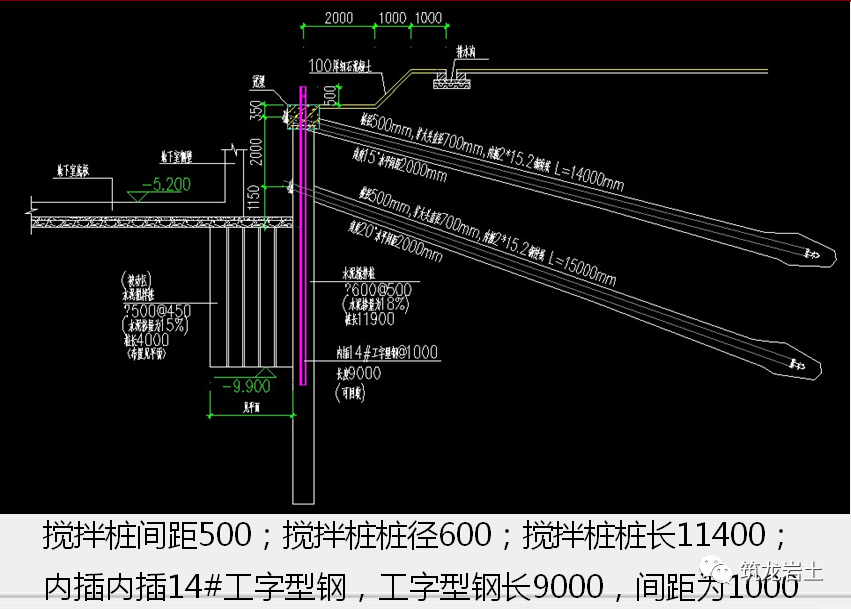 2. 锚杆要有一定的覆盖深度,才能有一定的抗拔力。3. 预应力锚杆能对挡土桩、墙的位移有较好的控制作用。(1)注浆加筋水泥土桩锚支护适用于软土厚度不大于2m或混合地层不宜在深厚淤泥中采用长度不宜大于10m,锚体间距不宜大于1.2m。(2)高压旋喷加筋水泥土桩锚支护适用于软弱的淤泥层和松散的砂土层。桩锚长度应按计算确定,桩墙体嵌固长度宜进入隔水层1~2m,锚体长度不宜小于1~1.5倍基坑深度,间距不宜大于1.5m,直径宜为0.3 ~0.8m,按梅花形布置。(3)搅拌加筋水泥土桩锚支护适用于较厚的软弱淤泥层、松散粉细砂或砾石层。长度应按计算确定,桩墙体嵌固长度宜进入隔水层1 ~2m,锚体长度不宜小于1.0 ~1.5倍基坑深度,间距不宜大于1.5m,直径宜为0.2 ~0.8m,按梅花形布置。(4)斜向地锚体与水平面的夹角宜采用15° ~ 35°加筋水泥土桩锚支护设计的内容包括荷载计。1) 根据锚固段所处的地层条件,锚杆可采用土层锚杆或岩层锚杆;需要控制支护结构变形时,应采用预应力锚杆。2)锚杆的设计内容应包括锚杆承载力计算、锚杆杆体截面和长度的确定、锚杆构造要求及锚头与锚固体的设计等。