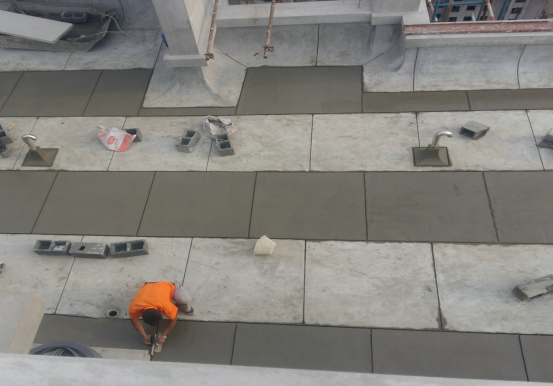 在屋面卷材防水层保护层施工完成后,即开始进行刚性屋面施工,先根据单元模块的排版图纸进行整体的分隔缝放线,宽度控制在20mm以内,女儿墙四周也要弹好单元分割线;施工时根据设计坡度要求拉线找坡、顺排水方向做标块处理,要求表面应平整、光滑,不得有积水现象。