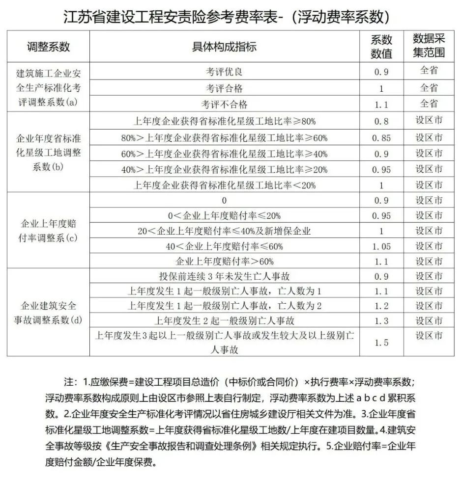 本意见提出基准费率和浮动费率系数参考标准(见附件2),各设区市建设主管部门可商保险机构确定本地区建设工程安责险基准费率和浮动费率系数,并在运行一定周期后(建议三年),对辖区内建设工程保险费率、赔付情况、事故预防开支等相关数据分析基础上,按照保险机构保本微利和事故预防服务与保险理赔服务并重的原则,保险机构及时调整基准费率、浮动费率系数和事故预防专项资金提取比例,并报省住房和城乡建设厅。