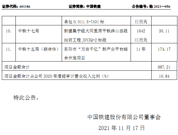 中国铁建公告,近期公司中标11个重大项目,项目金额合计987.21亿元,占公司2020年度经审计营业收入10.84%。