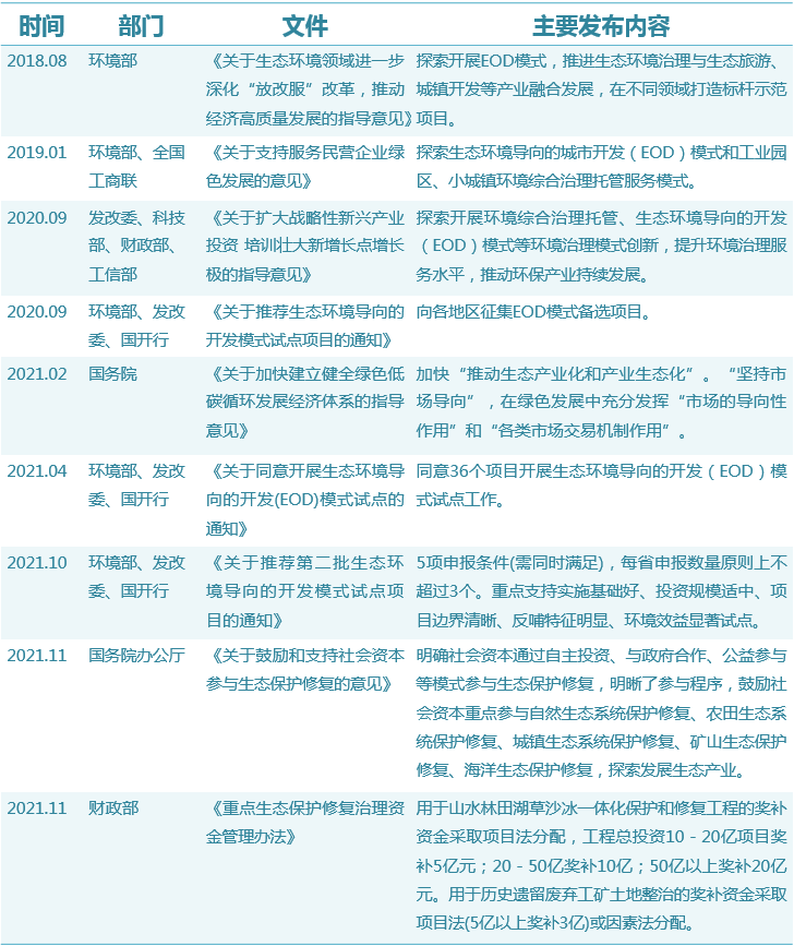 2021年4月,生态环境部、发改委和国开行联合印发《关于同意开展生态环境导向的开发(EOD)模式试点的通知》,集中梳理天津、河北、内蒙古等20个省(区、市)的36个典型意义试点项目,主要涉及流域治理、生态农业、矿山修复、沙漠治理、“无废城市”等。