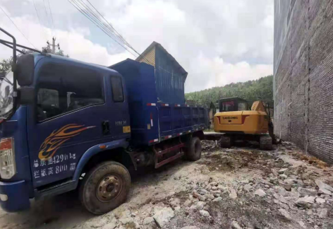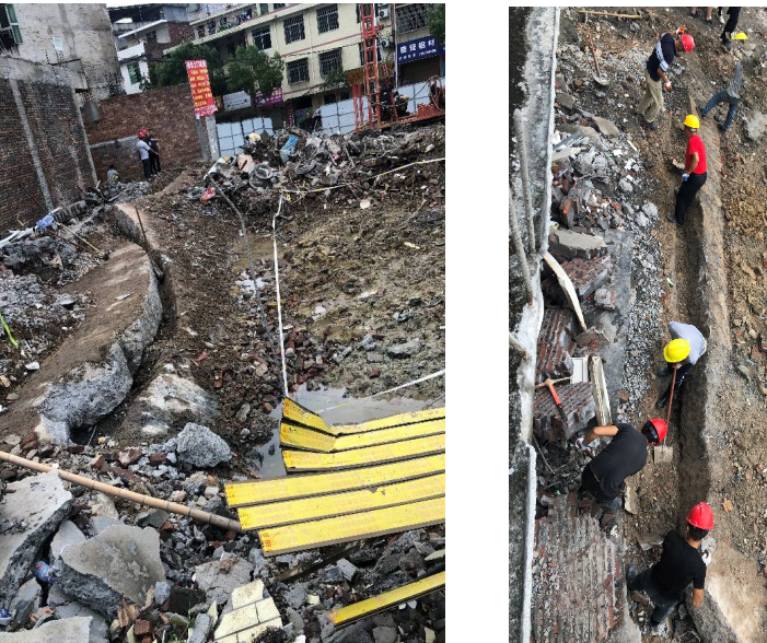 2021年6月19日,何超联系挖掘机师傅何建峰和两名拖渣土司机前来开挖地基,当天6时30分,放完鞭炮后开始施工。何超按照其父何春养的交待,要求何建峰操作挖掘机开挖地基时,要比隔壁何义勇的房屋基底挖深100mm。何建峰从西北角靠何义勇房屋位置开始开挖,开挖初始发现地基土质较差,基本为烂泥,开挖实际深度约1.4~1.5m,长度约9m。至11时50分左右,因外运渣土污染房前道路,被巡查的县城管局执法人员发现,当场责令其停工整改并暂扣了运土车辆。随后,何超、何建峰、何春养等人陆续离开施工现场准备去吃中饭。12时35分,县城管局执法人员驱车离开现场。12时37分左右,何义勇房屋整体向西南侧倾覆坍塌,并将洗车棚压倒,共造成12人被困于坍塌房屋内(其中洗车棚内1人),何建峰停靠在施工现场的挖掘机被压入土中(图7-图9)。