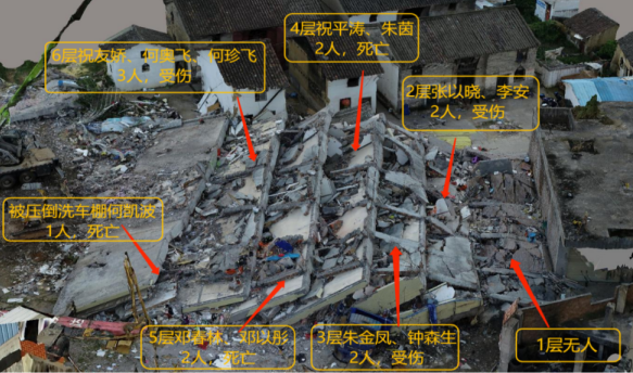 事故发生后,郴州市人民政府立即启动应急响应,应急管理部、住房和城乡建设部派出工作组连夜赶赴现场指导救援。省委常委、常务副省长谢建辉第一时间赶到省应急厅指挥中心坐镇指挥,副省长陈文浩率领省安委办主任、省应急厅厅长李大剑,副厅长喻树长,省自然资源厅厅长陈仲伯,省住房和城乡建设厅厅长鹿山,省消防救援总队总队长高宁宇,省第一测绘院院长雷宇斌迅速赶往事故现场指导应急处置,并紧急调派省医疗急救专家增援。郴州市委书记刘志仁、代市长吴巨培等市领导第一时间赶往现场、靠前指挥,郴州市、汝城县两级政府、郴州军分区、武警郴州支队、武警交通四大队、蓝天救援队等部门和单位积极参与,省应急厅紧急调集中联重科、三一重工、省交水建集团、湖南建工集团、国家矿山救援郴州队、长沙阳光救援队和长沙、株洲、湘潭、衡阳及训保支队等消防救援力量赶赴现场增援。经过18小时全力救援,至6月20日5时50分许,12名被困人员全部救出(伤亡人员分布详见图10)。其中,7人生还,5人遇难。整个应急处置过程行动迅速、救援有力、效果明显,未发生次生事故。同时,汝城县委县政府积极做好有关善后工作,确保了社会大局稳定。
