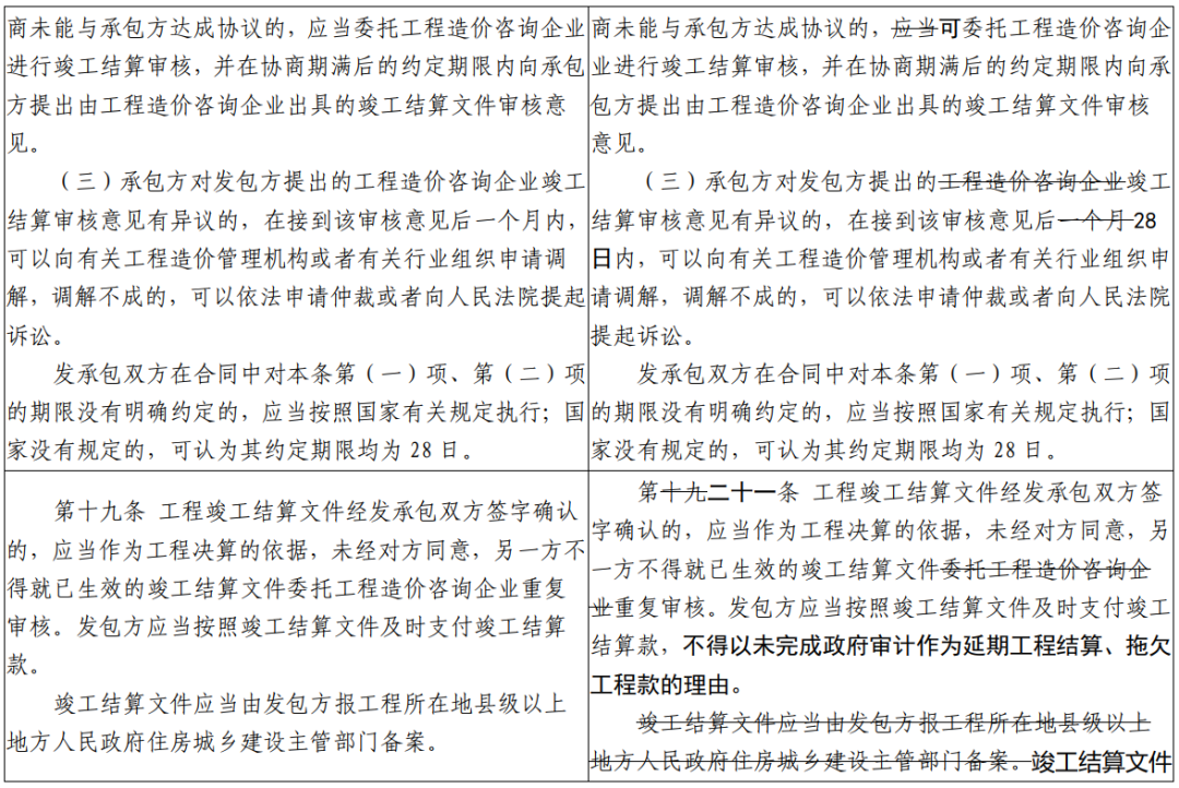 各省、自治区住房和城乡建设厅,直辖市住房和城乡建设(管)委,新疆生产建设兵团住房和城乡建设局,国务院有关部门建设工程造价管理机构,各有关单位:为贯彻落实国务院“放管服”改革要求,促进建筑业高质量发展,我们修订了《建筑工程施工发包与承包计价管理办法》,形成征求意见稿,现送你们征求意见。请于12月25日前将书面意见反馈我司。联系邮箱:chengm@mohurd.gov.cn联系地址:北京市海淀区三里河路9号 住房和城乡建设部标准定额司(信封请注明“施工发承包计价管理办法征求意见”字样),邮编:1008351.《建筑工程施工发包与承包计价管理办法》(修订征求意见稿)2.关于《建筑工程施工发包与承包计价管理办法》修订说明关于《建筑工程施工发包与承包计价管理办法》修订说明《建筑工程施工发包与承包计价管理办法》(住房和城乡建设部令第16号)自2014年2月实施以来,对规范计价行为、加强造价管控、维护建设各方合法权益发挥了重要作用。随着工程造价市场化改革和行政审批制度改革的推进,16号部令部分条款已不能满足建筑工程发承包计价管理的需要。为促进建筑业高质量发展,加快推动转型升级,按照建筑法、工程造价改革工作方案精神,我们对16号部令进行了修订。现说明如下。一是正确处理政府与市场的关系。为充分发挥市场在资源配置中的决定性作用,结合工程造价改革工作方案有关内容,不断完善各项制度。二是坚持问题导向。聚焦建筑工程发承包计价活动中各方市场主体反应强烈的计价依据难以满足市场需求、价格竞争不充分、竣工结算不及时等突出问题,提出解决方案。三是持续深化“放管服”改革。减轻企业负担,降低制度性经营成本。进一步明确建筑工程发承包计价依据的组成内容;明确各级住房和城乡建设主管部门在建筑工程发承包计价活动中的职责;明确最高投标限价按市场价格编制,鼓励建筑市场各方主体加强工程造价数据积累,积极运用信息化技术为概预算编制提供依据。贯彻落实《国务院关于深化“证照分离”改革 进一步激发市场主体发展活力的通知》(国发〔2021〕7号)和《国务院办公厅关于全面开展工程建设项目审批制度改革的实施意见》(国办发〔2019〕11号)精神,取消工程造价咨询企业资质的要求,取消最高投标限价及其成果文件备案的相关规定,减轻企业负担。为贯彻落实国务院决策部署,进一步做好清理政府部门和国有企业拖欠民营企业中小企业账款工作,增加推行建筑工程施工过程结算的条款。明确过程结算的内容,规定过程结算开展的基本流程和时限要求,提出不得以未完成政府审计作为延期结算理由。三是规范文字表述。将“住房城乡建设主管部门”统一修改为“住房和城乡建设主管部门”;将“县级以上地方人民政府”统一修改为“县级以上人民政府”;将“工程计价有关规定和市场价格信息”统一修改为“工程计价依据”。此外,关于信用管理、行业自律、工程造价成果文件的具体要求、造价工程师责任落实等内容拟在《工程造价咨询业管理办法》修订工作中予以考虑,本办法不再赘述。