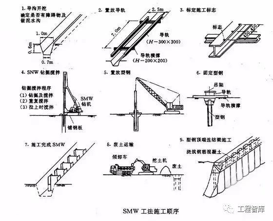 SMW工法亦称劲性水泥土搅拌桩法,即在水泥土桩内插入H型钢等(多数为H型钢,亦有插入拉伸式钢板桩、钢管等),将承受荷载与防渗挡水结合起来,使之成为同时具有受力与抗渗两种功能的支护结构的围护墙。