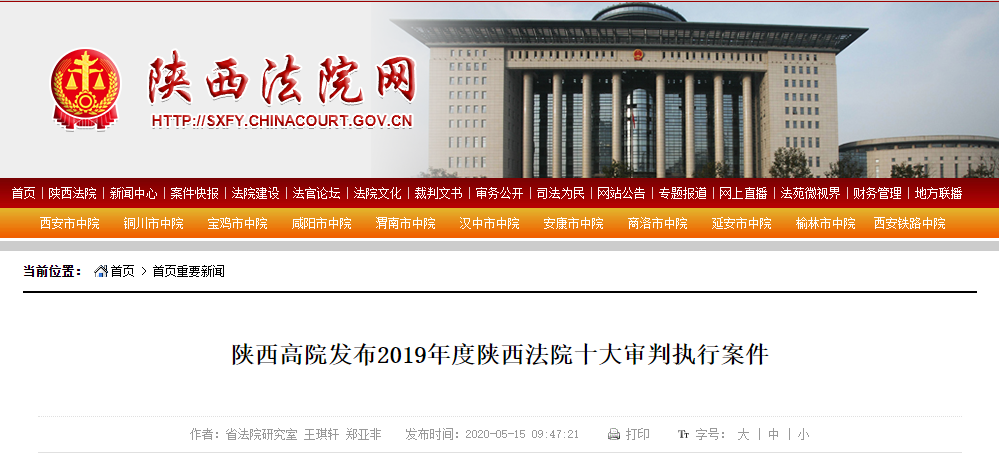 2020年5月15日,陕西高院向社会发布2019年度陕西法院十大审判执行案件。