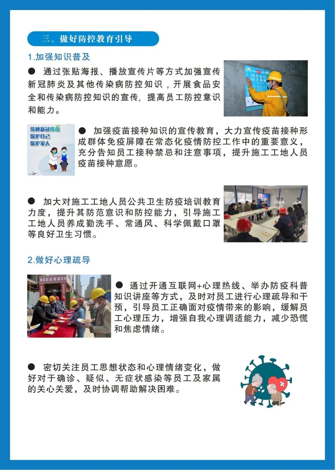 3.4.1 通过宣传栏、公告栏、专题讲座、线上培训、班前教育、技术交底等方式,加强对施工现场人员防疫政策、健康知识的宣传教育培训,着力提升从业人员的防范意识和防控能力。