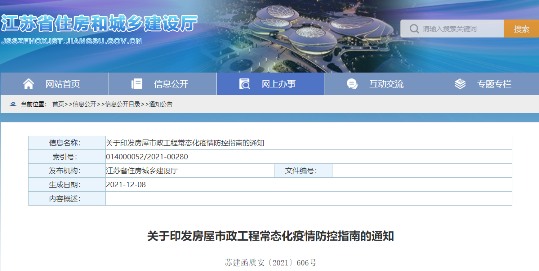 12月8日,江苏省住建厅印发新版《房屋市政工程常态化疫情防控指南》。