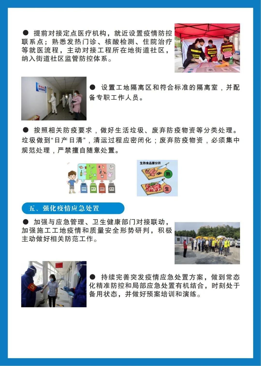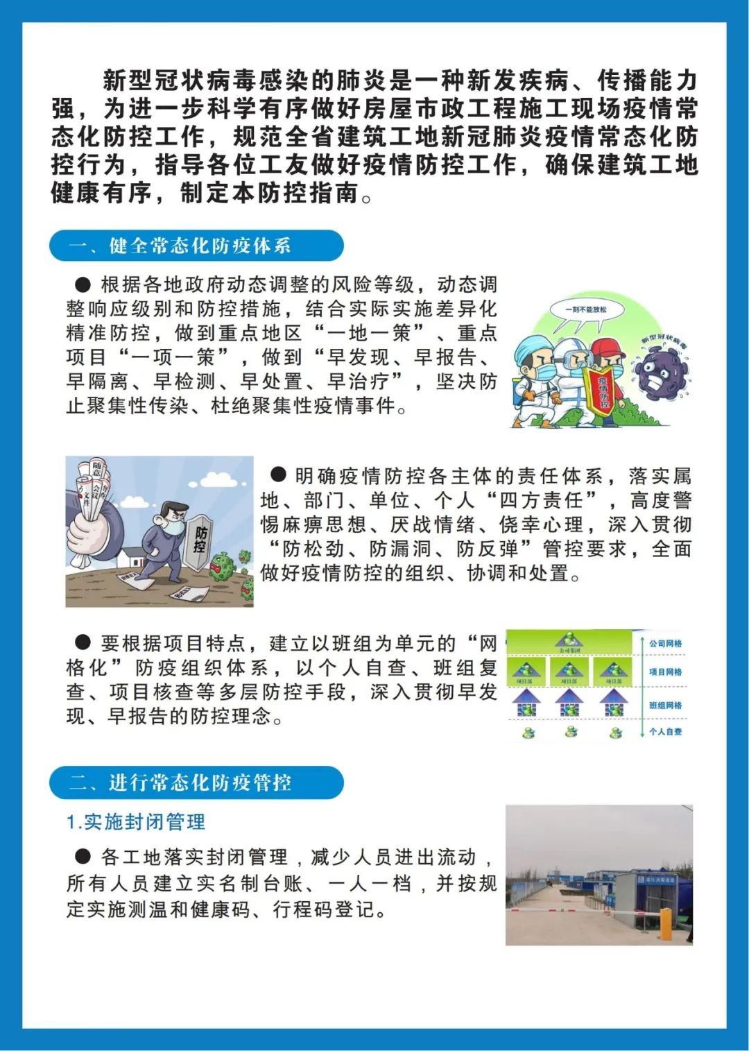 为有效应对新型冠状病毒感染的肺炎疫情,进一步指导房屋市政工程科学规范建立常态化防疫体系,开展常态化防疫管控、防控教育引导、防疫后勤保障、疫情应急处置等工作,确保压紧压实建筑工地常态化疫情防控责任,切实保障从业人员身体健康和生命安全,我厅在2020年印发《房屋市政工程复工疫情防控指南》基础上,研究制定了《房屋市政工程常态化疫情防控指南》,现印发你们,请各地建设主管部门和工程安全监督机构积极宣传,在施工现场醒目位置张贴,引导企业遵照执行,推动各项疫情防控措施落地见效。