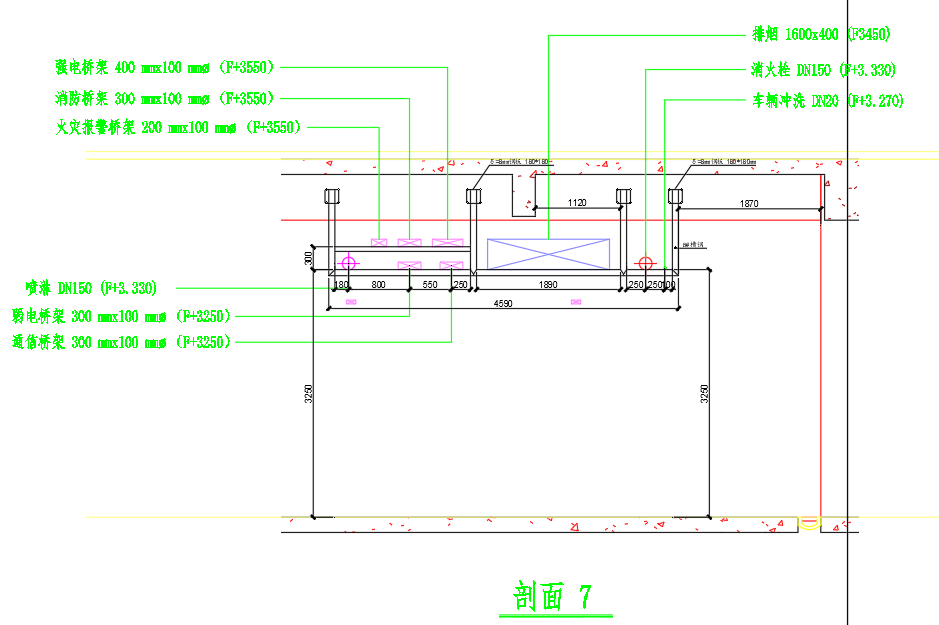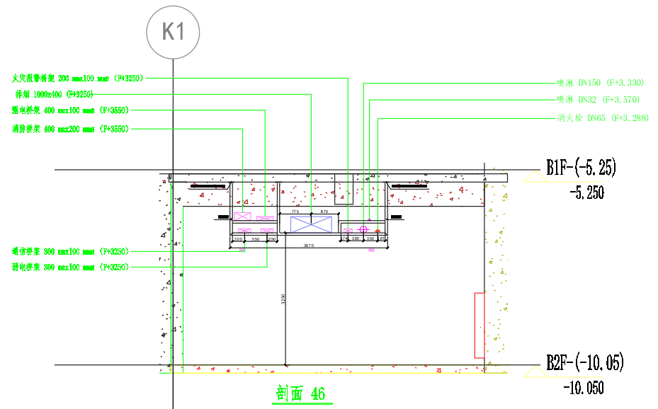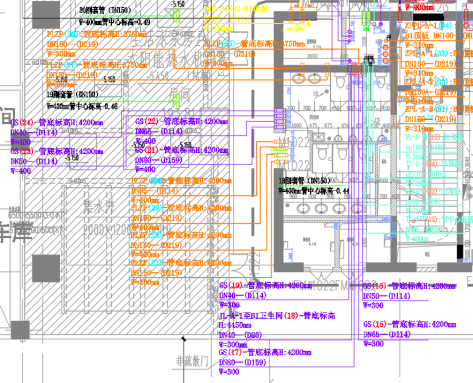 (1)归拢主干管线,然后次支管线:有机械车位的排布在车道上,牺牲车道空间;若没有机械车位,排布在车位上空,牺牲车位净高;若整体地下室净高条件较低,优先牺牲车位上净高。(2)定位排水管(无压管):排水管为无压管,不能上下翻转,应保持直线,满足坡度。一般应将其起点(最高点)尽量贴梁底(优先考虑梁内预埋,起点距离板下5~10cm),使其尽可能提高。(3)定位风管(大管):各类风管尺寸比较大,需要较大的施工空间,所以接下来应定位各类风管的位置。风管上方有排水管的(尽量避开排水管,并排处理),安装在排水管之下;风管上方没有排水管的,尽量贴梁底安装。(4)确定了无压管和大管的位置后,余下的就是各类有压水管,桥架等管道。此类管道一般可以翻转弯曲,布置较灵活。其中要注意矿物绝缘电缆的路径和电缆选择,条件允许建议采购柔性矿物绝缘电缆。(5)成排的桥架、管道的外壁之间预留100mm~150mm,要注意管道和风管的保温厚度、桥架的弯曲半径。所述为管线布置基本原则,管线综合协调过程中根据实际情况综合布置。