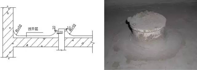管根及墙角处抹圆弧,半径10mm。管根与找平层之间应留出20mm宽、10mm深凹槽。