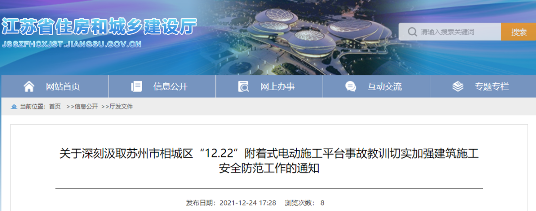 2021年12月22日9时15分左右,苏州市相城区富元家园小区外立面改造工程,在7#楼东北侧附着式电动施工平台拆除过程中,发生一起平台高处坠落事故,导致3人死亡。建设单位是苏州市高铁新城建设投资有限责任公司,施工单位是苏州正亚建设发展有限公司,专业分包单位是北京星河模板脚手架工程有限公司,监理单位是苏州卓越建设项目管理有限公司。