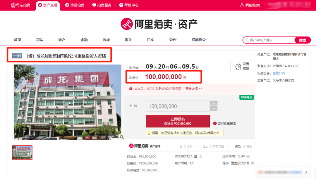 近日,淘宝网阿里拍卖破产清算处置平台发布一则拍卖信息,名为“(破)成龙建设集团有限公司重整投资人资格”的标的以1亿元底价起拍。竞拍日期是2021年12月30日上午10时至2021年12月31日上午10时止(延时除外),竞价周期为1天。