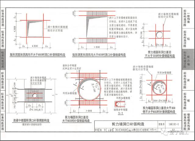 (3)板上孔洞除结施图已标注的大洞外,尚应配合各专业图预留,当孔洞尺寸不大于300时,钢筋绕过洞口,参照图集16G101-1第110页;孔洞尺寸大于300小于1000时,应按参照 16G101-1图集第111页,采取洞边加强措施。