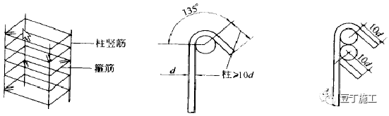 6、按抗震要求,柱箍筋端头应弯成135°,平直部分长度不小于10d(d为箍筋直径)。
