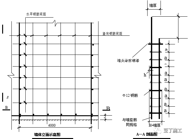 制作方法:梯架钢筋与墙竖向钢筋同规格、同牌号,要求2根梯架钢筋一长一短,留出绑扎搭接接头错开距离L,上中下至少设置3根与墙同宽的梯凳筋(兼做撑筋),两端必须用砂轮切割机切平并涂上防锈漆,其余梯凳筋长度应为H-10mm(即梯凳筋端头保护层为5mm),梯凳筋与梯架筋点焊即可。