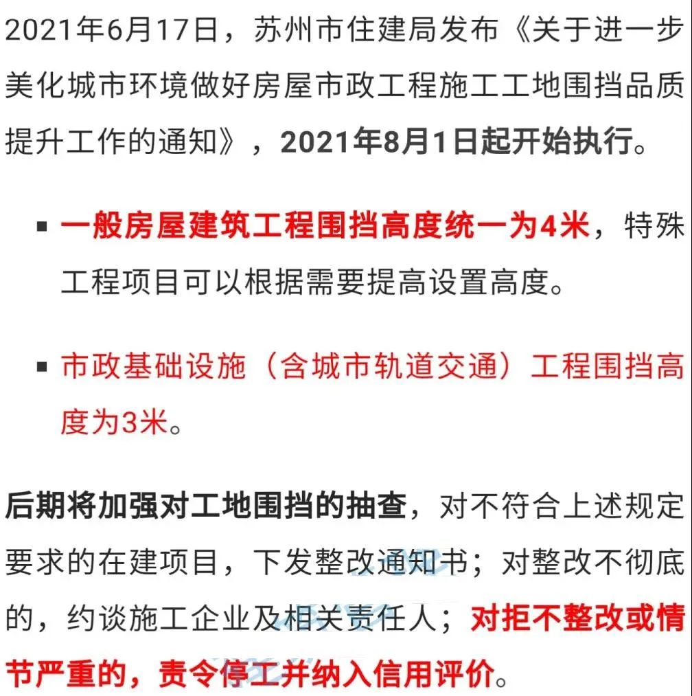 苏州要求房建工程围挡高度统一设置4米,2021年8月1日起执行。