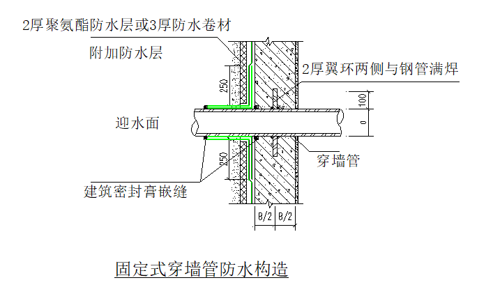结构变形或管道伸缩量较小时,穿墙管可采用主管直接埋入混凝土内的固定防水做法,主管应加焊止水环,并应在迎水面预留20深、30宽凹槽,凹槽内采用油膏密封材料嵌填密实。穿墙管应在浇筑墙体混凝土时预埋。穿墙管与内墙角、凹凸部位的距离应大于250mm。相邻穿墙管间的间距应大于300 mm。