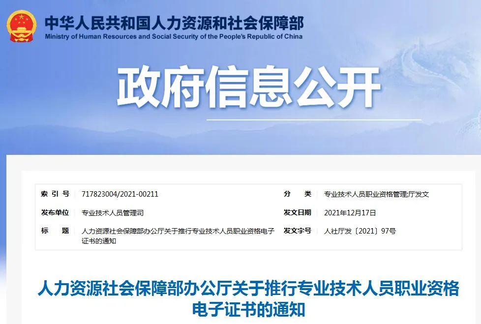 为贯彻落实党中央、国务院深化“放管服”改革决策部署,根据《中华人民共和国电子签名法》《国务院关于在线政务服务的若干规定》和《国务院关于加快推进全国一体化在线政务服务平台建设的指导意见》等相关法律、法规和规定,经商有关部门同意,决定在专业技术人员职业资格中推行电子证书。现就有关事项通知如下: